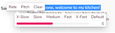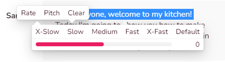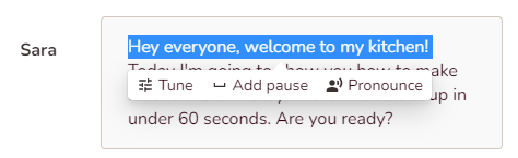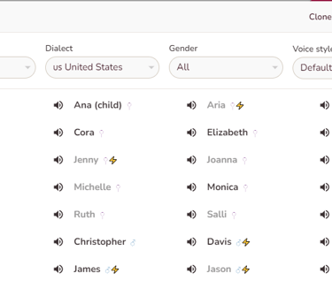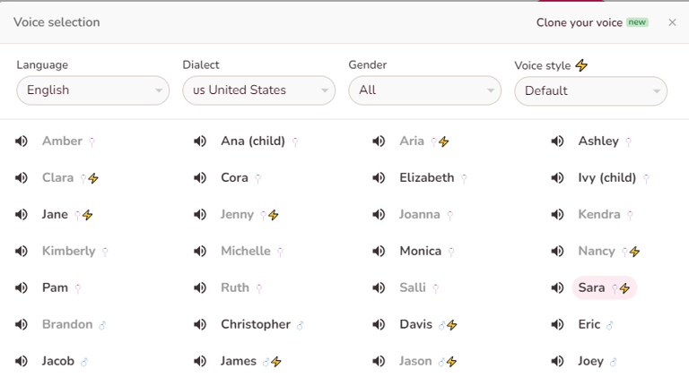 The at the right of image let you play the voice over for the text in the box. If you don't like the sound, click on "Sara" to change the voice. Choose the language, accent, gender, and tone that best suits your video. Press the sound icon to preview the voice.