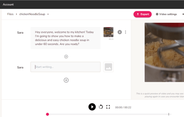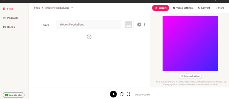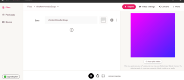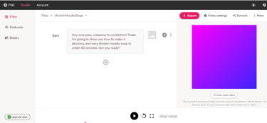 Enter a file name (e.g. chickenNoodleSoup) and select the video language. You can create a video or audio file, but for this example, select "Video" and click "Create", This is the working space you are going to see.