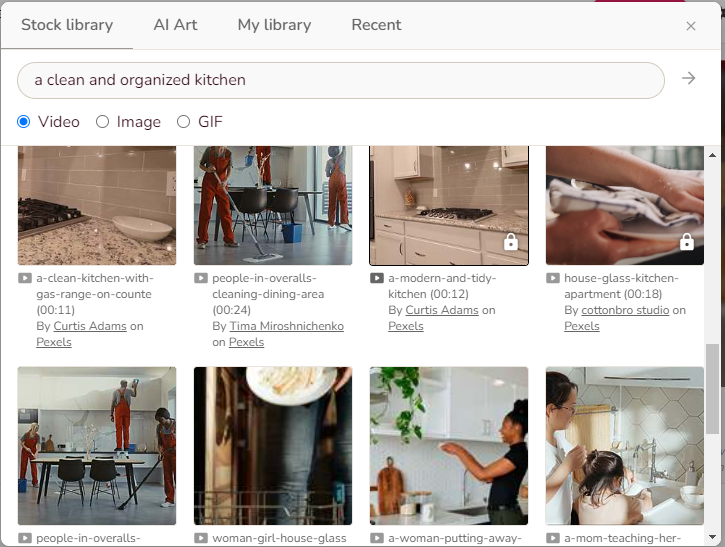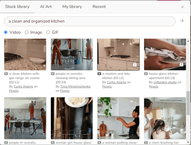 Let's start from replacing the image/video for the first text box, we want to show a clean and organized kitchen. Click on the image next to the first text box, type in "a clean and organized kitchen" and hit enter. Many related videos will appear. Hover over a video to preview it; click on the one you'd like to use to replace the first text box's video. Some of the videos in the list have a lock sign at the bottom, indicating they are only available with a paid plan. If you don't find a good video, switch to "Image" and search again; images usually offer more options.
