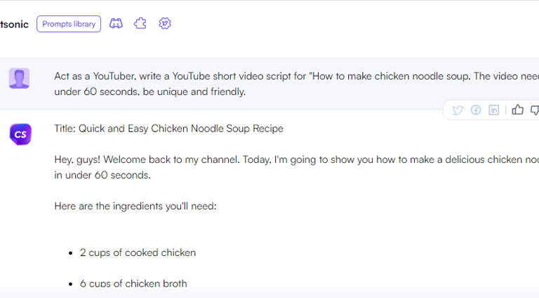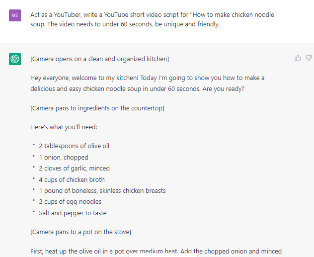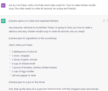Ask ChatGPT to write a video script for you. You can type in something like "Act as a YouTuber, write a YouTube short video script for "How to make chicken noodle soup. The video needs to under 60 seconds, be unique and friendly." ChatGPT will write the script for you in a minute, including camera shots and good hints for video backgrounds. Amazing!
