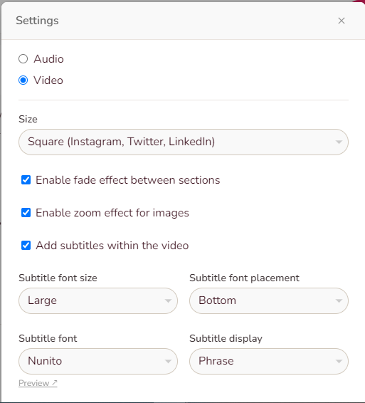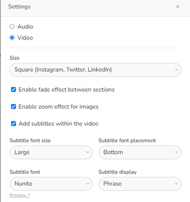Now click on to select your video size, subtitle font, and where to display them. Make sure that your viewers have the best viewing experience possible.