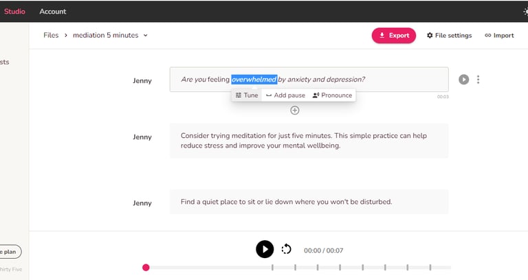 This software currently has the most realistic voiceover using AI voice in many languages. You can adjust the voiceover speed, pitch, add pause. You can also crate podcasts and audio books, audio files using the software.